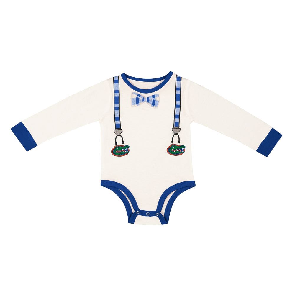 Show off your little one's team spirit with the Florida Gators Infant Suspenders Longsleeve Onesie. This stylish piece combines a sophisticated suspenders design with vibrant team colors, giving your baby a cool, confident look. Crafted for comfort and pride, it’s the perfect way to dress your infant in Gators swag from head to toe.