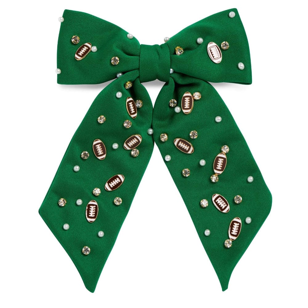 Show your South Florida Bulls pride with the Game Day Bow Clip, featuring an oversized bow adorned with football charms, sparkling rhinestones, and faux pearls. Perfect for game days or watch parties, this clip easily adds a vibrant touch of team spirit to any look. Stand out in the crowd with a bold, fun accessory that celebrates your favorite team in style. Go Bulls!