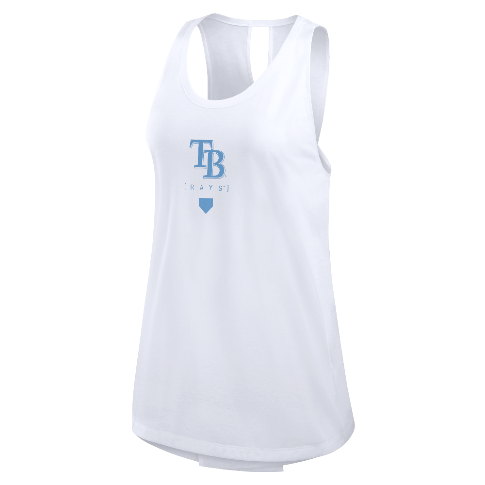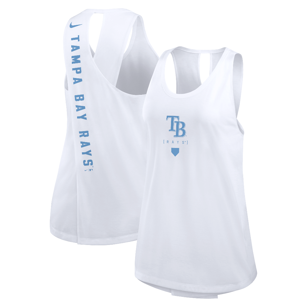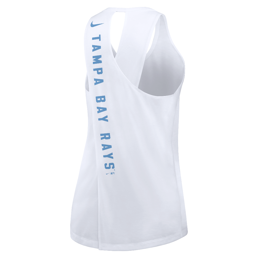 During the summer heat of baseball season, stay cool in this Tampa Bay Rays Women's Team Crossed Back Tank Top from Nike. Its contrasting trim in a team color highlights the Tampa Bay Rays graphics printed across the front. A unique crossed-back and flattering droptail hem also provide that classic tank top look and feel.