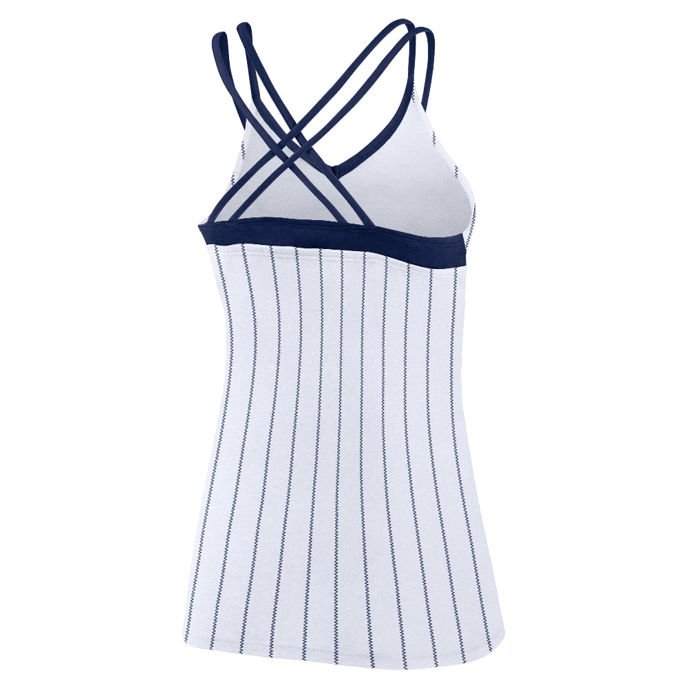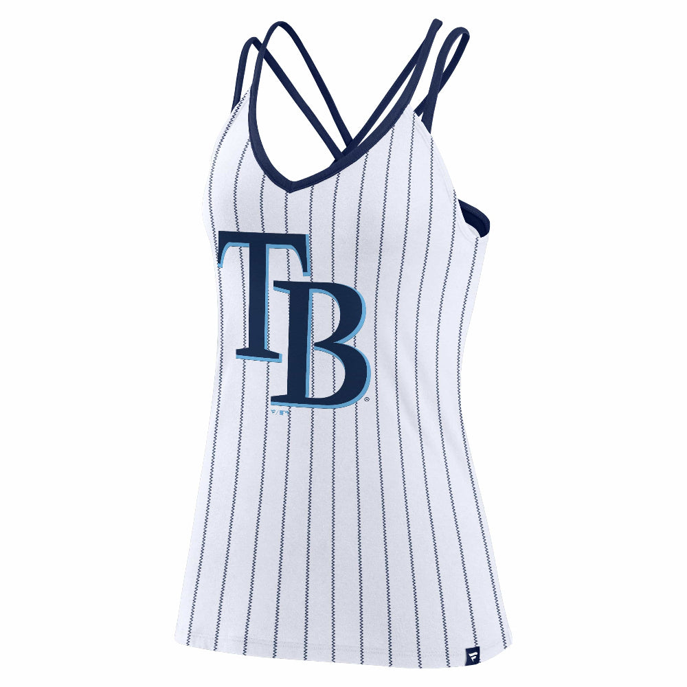 While your Tampa Bay Rays are wrangling opponents, comfortably cheer them on in this Women's TB Cap Logo Pinstripe Strappy Back Tank Top from Fanatics Branded. It features contrasting straps that focus attention on the Tampa Bay Rays logo and cross in the back for added support. Plus, the V-neckline gives this summer essential a stylish finishing touch.