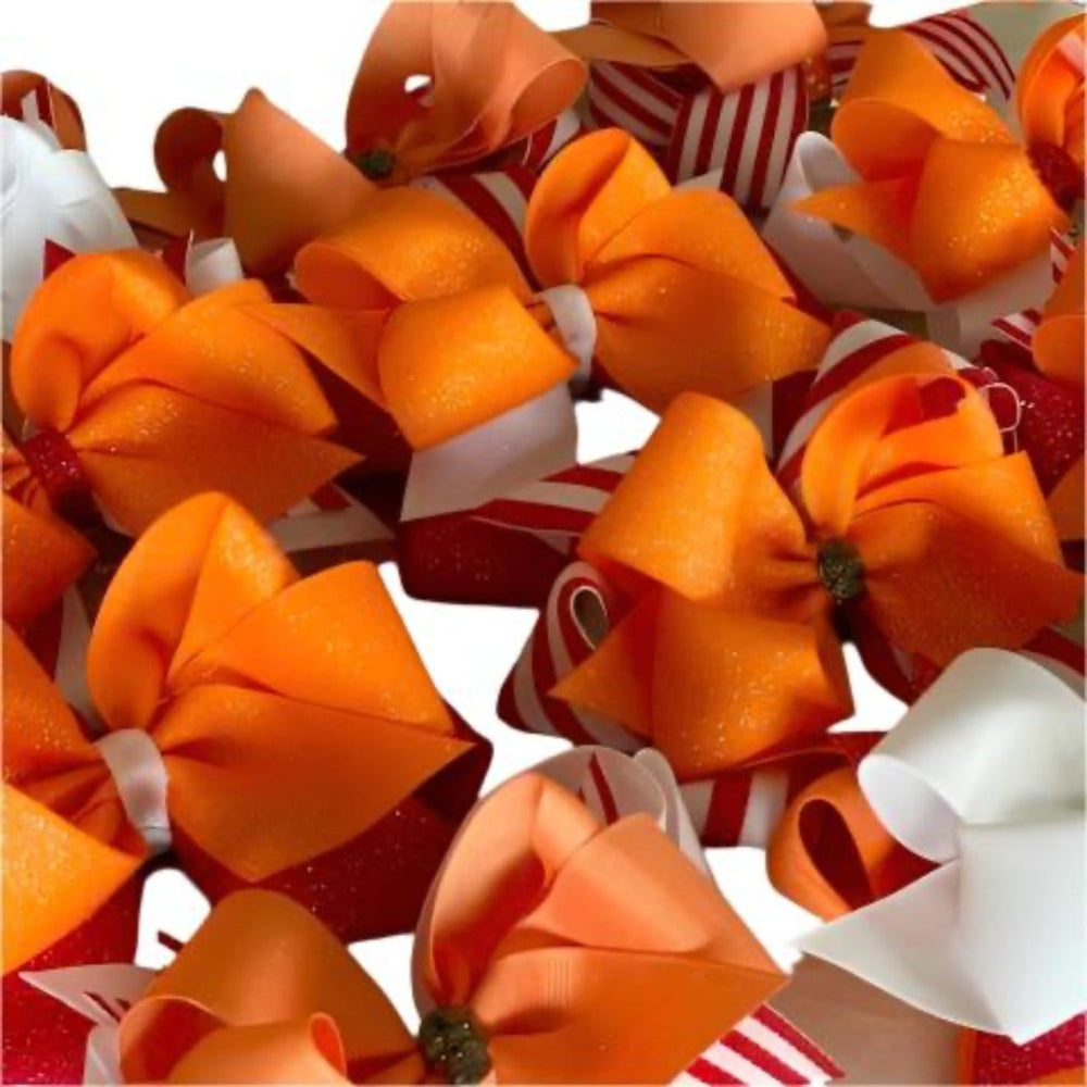 Celebrate the Tampa Bay Buccaneers in style with this large hair bow! Featuring your favorite team colors, including the retro creamsicle hue, this bow is perfect for game day or showing your support for Bucco Bruce. Makes a great addition to any fan's accessory collection. Go Bucs!